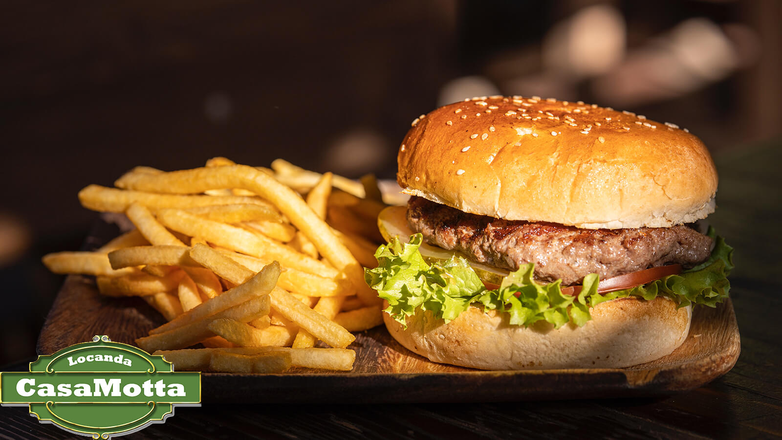 Beef Hamburgher Sasato, Tomato, Peppers and Onion Grilled, Pancetta and Emmenthal + French fries.
